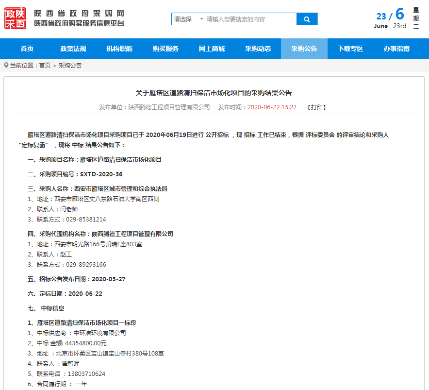 近日,中環潔中標西安市雁塔區道路清掃保潔市場化項目一標段。項目中標金額4435.5萬元,服務年限1年,服務范圍包含雁塔、等駕坡和曲江轄區城市道路,保潔總面積153.73萬㎡,綠化面積12.59萬㎡。服務內容分為道路人工清掃保潔部分,含道路清掃、綠化帶清掏撿拾、果皮箱(垃圾桶)及滅煙柱清掏擦洗、野廣告清理、道班房、保潔工具箱及休閑座椅等其他城市家具清潔;機械化作業;道路掃雪除冰;極端天氣等環境衛生應急整治及采購人要求的其他工作。